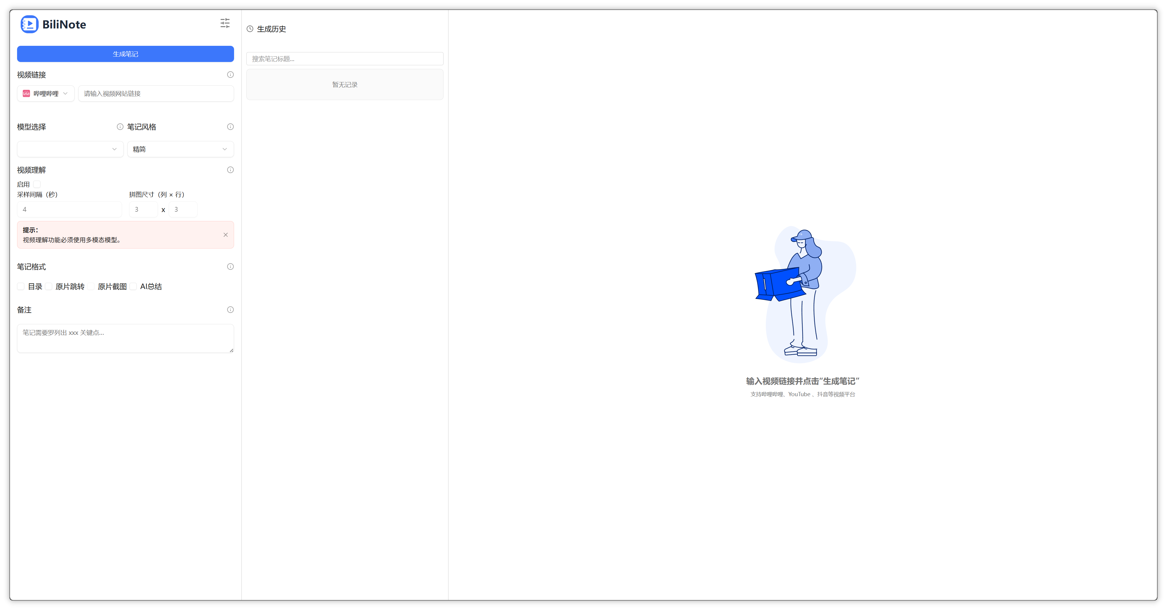 部署成功后,访问 http://localhost:3015 或 .env 文件中配置的 APP_PORT 所指定的端口,即可访问 BiliNote。 若端口已被占用,可在 .env 文件中修改 APP_PORT 的值并重新部署